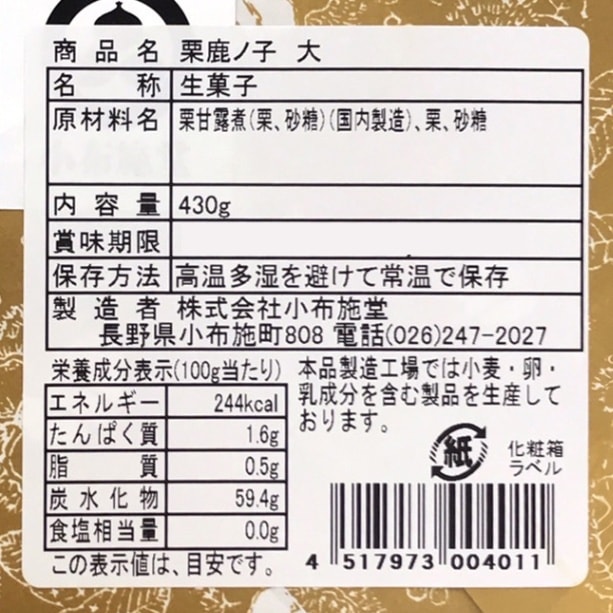 | 原材料 | 栗鹿の子:栗、砂糖 |